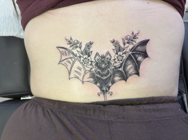 My half-done bat tattoo (which is now done – colour and all but I don’t have any great pictures of it).