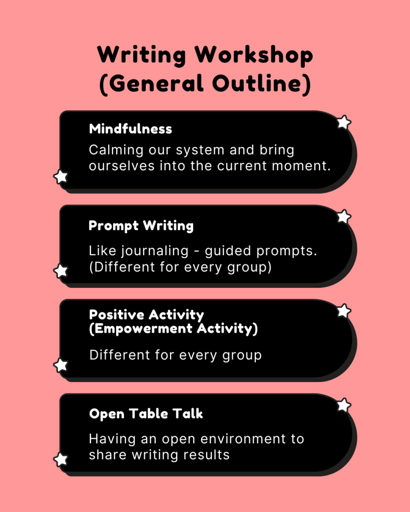 I try to split workshops into three different parts: mindfulness, prompt writing, and then a positive activity. Every workshop is different depending on the group.